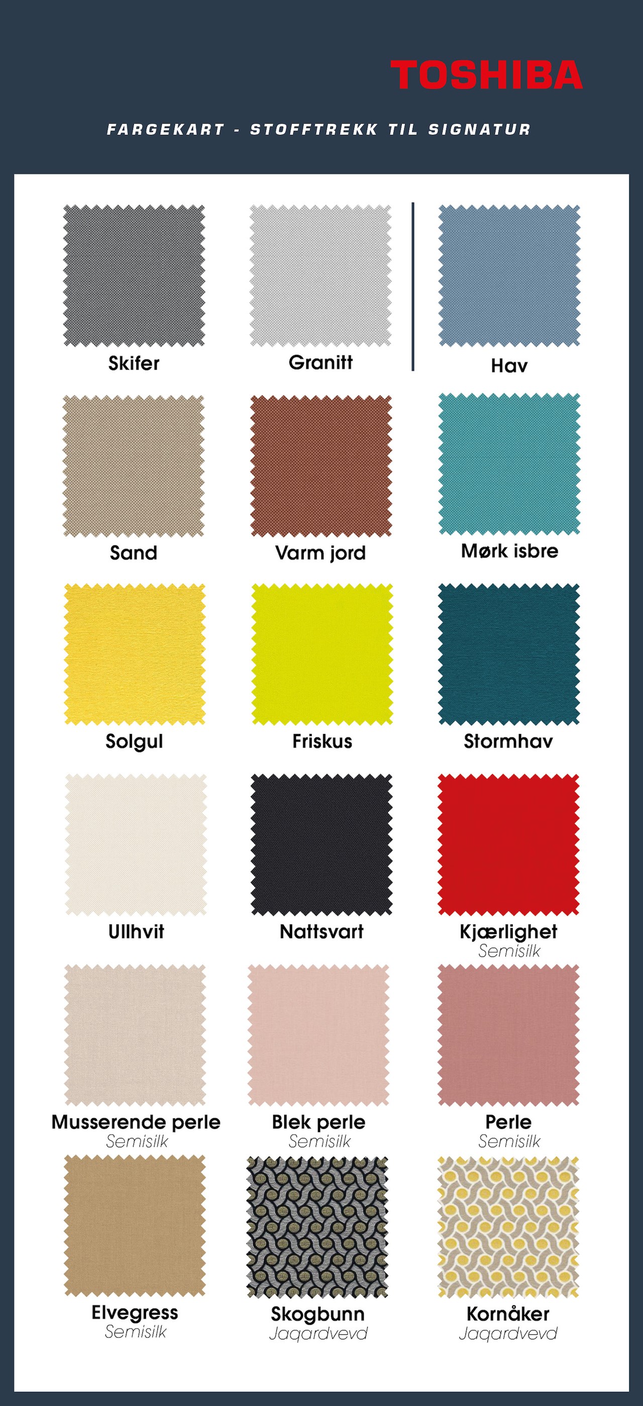 Vi har og designmodellen Signatur med front i utskiftbar tekstil. Ta kontakt med oss for bestilling og valg av farger.